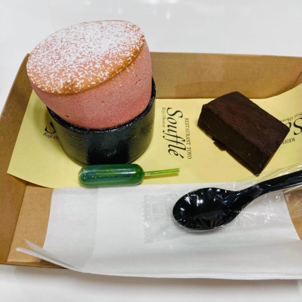 Restaurant TOYO Tokyo は、パティシエの大澤のスフレ・オ・フランボワーズとブーダンテリーヌ・ド・ショコラ 葉ワサビのソースと、通販でも販売しているビーフカレー、松阪牛ハンバーグ、八女茶のチーズケーキ、ブーダンテリーヌ・ド・ショコラ、レモンハーブのチーズケーキのテイクアウトで出店いたしました。
