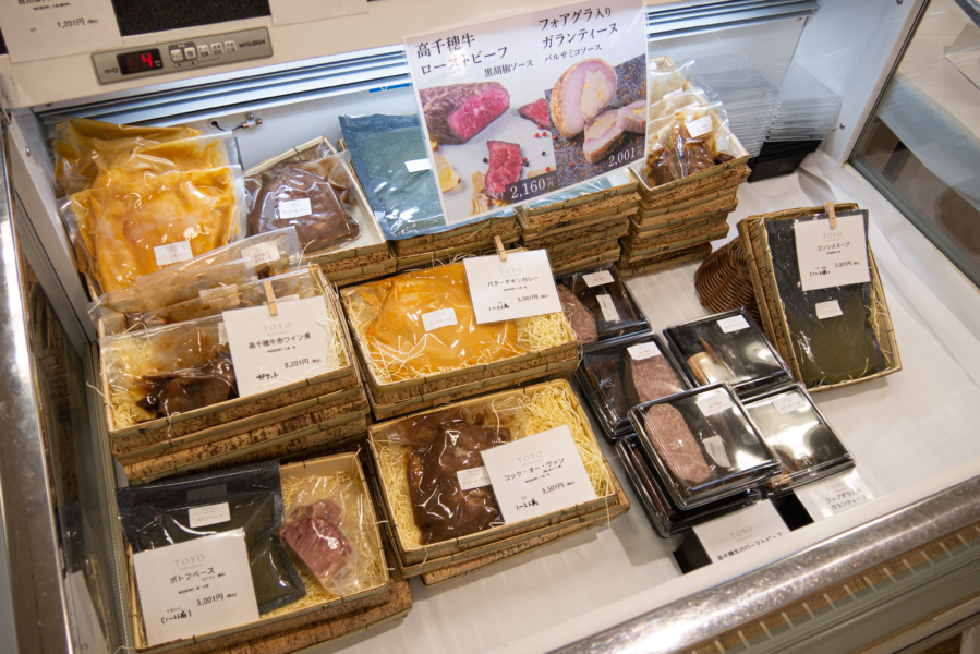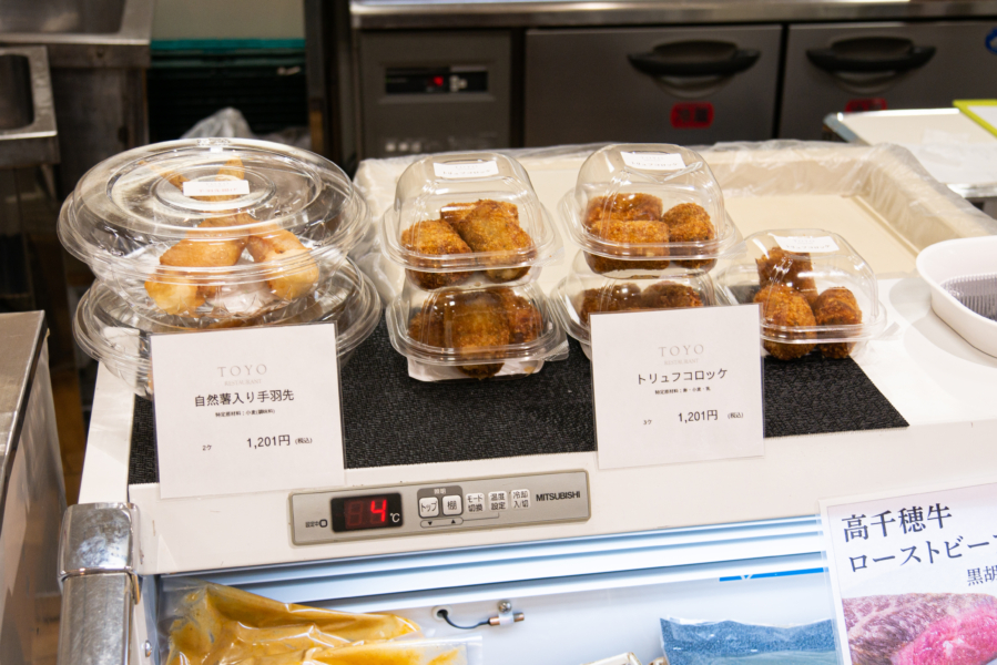 【惣菜】高千穂牛ローストビーフ 黒胡椒ソース、フォアグラ入りガランティーヌ バルサミコソース、自然薯入り手羽先、トリュフコロッケ、高千穂牛赤ワイン煮、コック・オー・ヴァン、バターチキンカレー、ポトフベース、コンソメスープ
