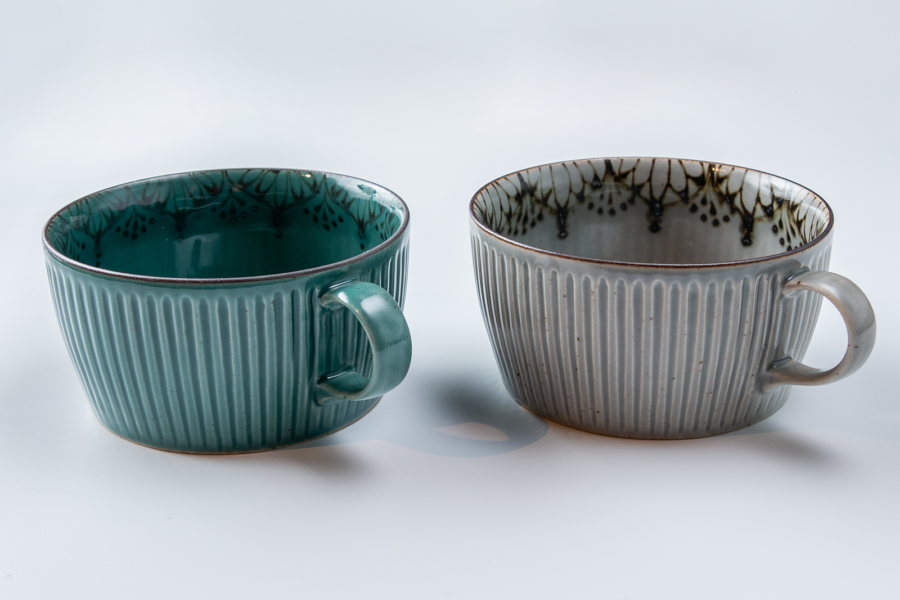 落ち着いたカラーの素地にしのぎが施されたスープマグ。