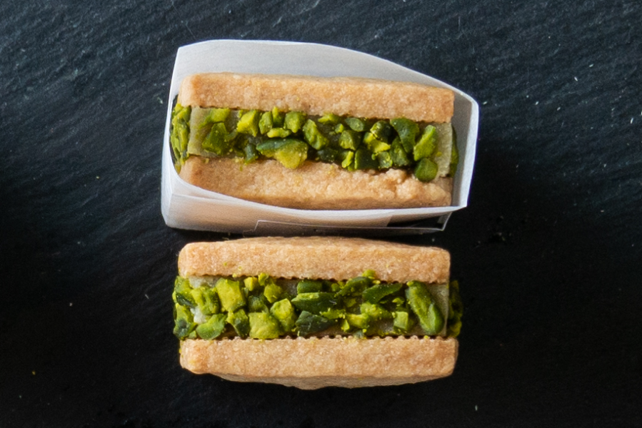 芳醇なコクが際立つピスタチオを使用したホワイトチョコレートベースのガナッシュを卵を使用しない全粒粉のビスケットでサンドしました。
