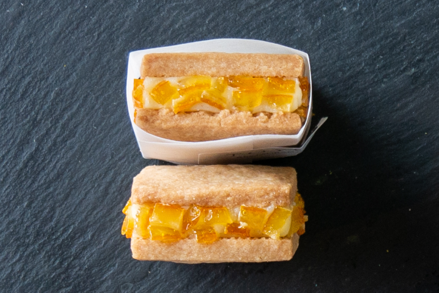 爽やかな酸味や程よい苦みはそのままに、甘みと苦味、フレッシュな味わいの八朔の使用したホワイトチョコレートベースのガナッシュを卵を使用しない全粒粉のビスケットでサンドしました。