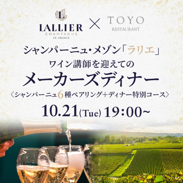 Restaurant TOYO Tokyoにて現在ハウスシャンパンとして使用しているメゾン「ラリエ」の全ラインナップを、丸山シェフによる特別コースとともに味わうメーカーズディナーを開催いたします。